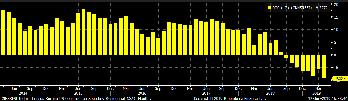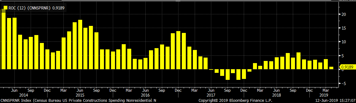 Seasonally adjusted April U.S. construction spending was flat MoM and down 1.23% YoY. Unadjusted private nonresidential construction spending was 0.65% higher MoM and 0.9% higher YoY. Unadjusted U.S. residential construction spending has been down YoY for the nine straight months, and continues to show as the weak point in construction data. This is April data and the effects of lower interest rates is not yet reflected the report.