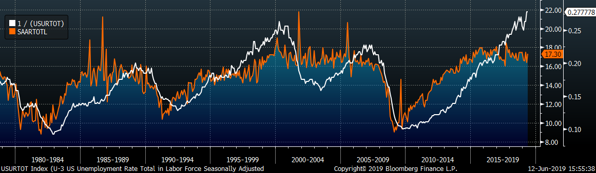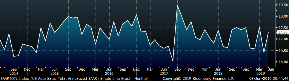 May annualized auto sales continued lower while the U.S. unemployment rate fell to 3.6%.