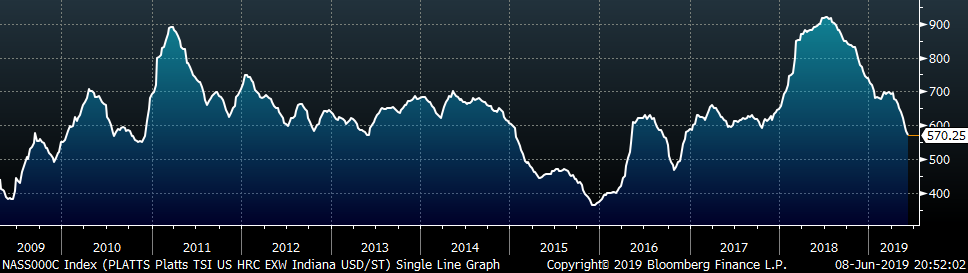 The Platts TSI Daily Midwest HRC Index was down $12.50 to $570.25.