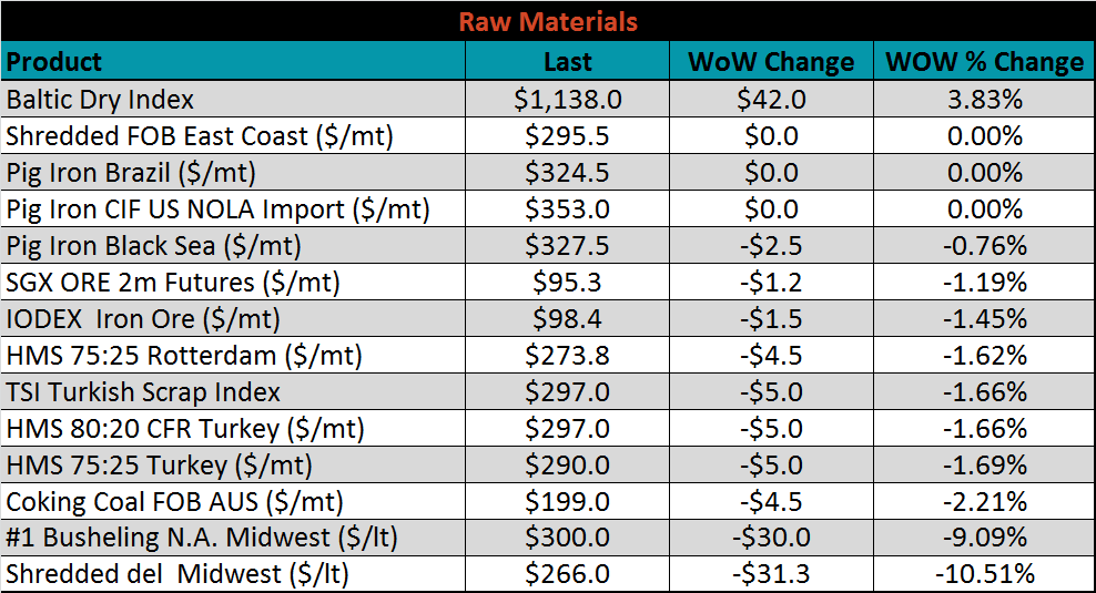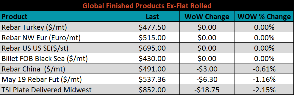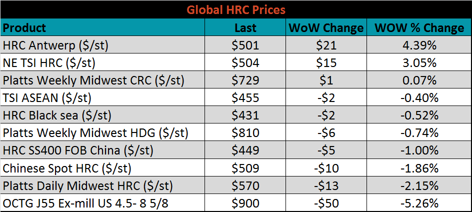 The global flat rolled indexes were mixed. Antwerp HRC is up 4.39%, while Platts Midwest HRC is down 2.2%.