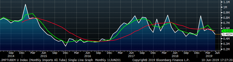 May tube import license data is forecasting a MoM decrease of 83k to 482k tons.