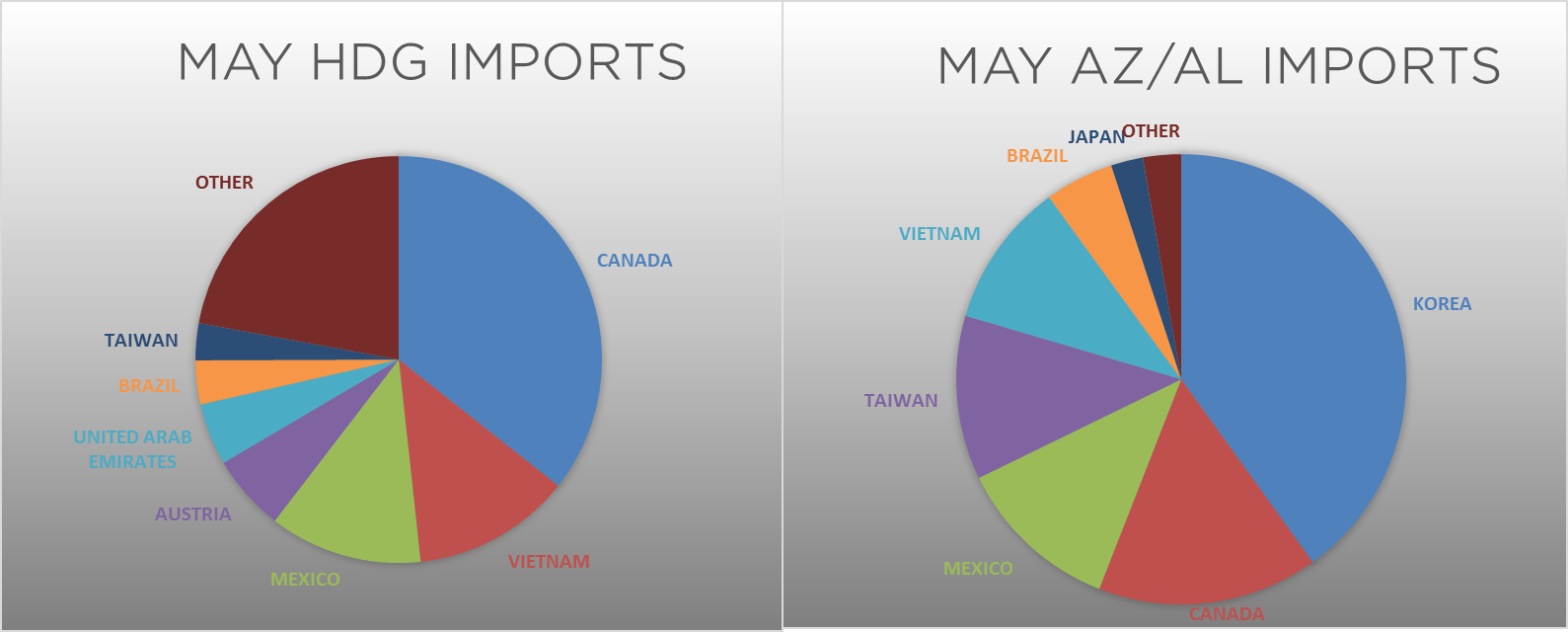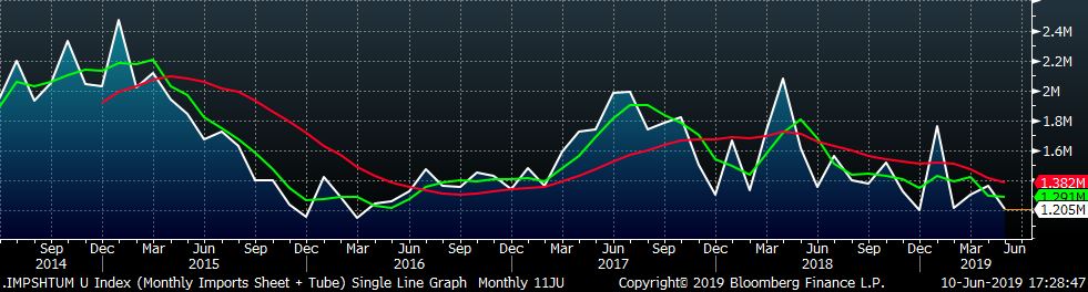 May flat rolled import license data is forecasting a decrease to 723k, down 65k MoM.