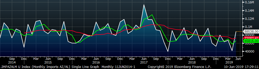 AZ/AL import licenses forecast an increase of 47k MoM to 90k in May.