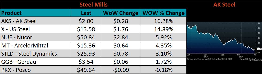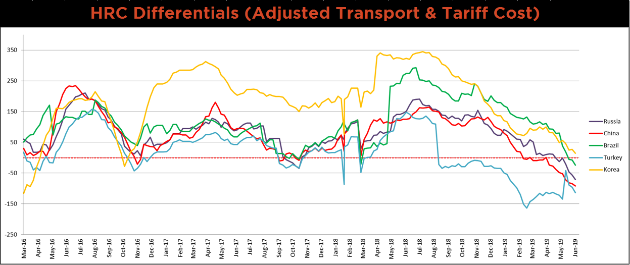Below is HRC Midwest vs. each listed country’s export price differential using pricing from SBB Platts. We have adjusted each export price to include any tariff or transportation cost to get a comparable delivered price. All of the price differentials moved lower last week, but Korea’s price differential remains above the only country that is not negative. Historically, the zero price differential level has acted as a bottoming signal for domestic HRC prices.