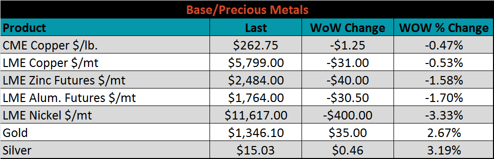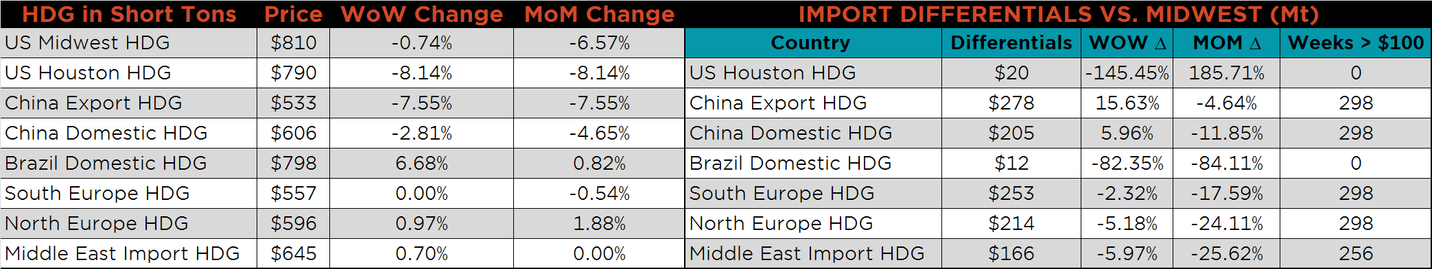 SBB Platt’s HRC, CRC and HDG pricing is below. Midwest HRC and HDG prices were lower on the week, 2.2%, and 0.7%, respectively, while the CRC price rose slightly. Brazilian domestic prices rose dramatically, while Chinese HDG, CRC and HRC export prices were all down, 7.6%, 1% and 0.8%, respectively.