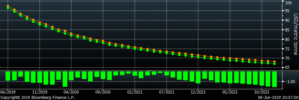 The CME Midwest HRC futures curve is shown below with last Friday’s settlements in white. The curve shifted lower in the front and in the back last week.