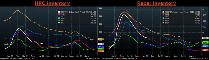 The AISI Capacity Utilization Rate was down 0.1 points to 81.2%. The Trump administration’s goal of 80% Capacity Utilization Rate has held since October 2018. Questions about the sustainability of these high production levels continue to mount as prices fall but mills are in a difficult position, as they would likely fall under scrutiny for taking furnaces offline.