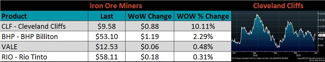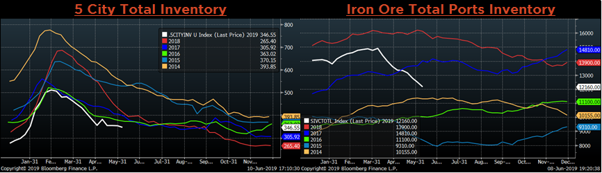 Below are inventory levels for Chinese finished steel products and iron ore. All four of the recorded inventories fell on the week. China is the largest iron ore importer, a decline this rapid of inventory suggests that prices have room to rally if global demand for steel is not stifled.