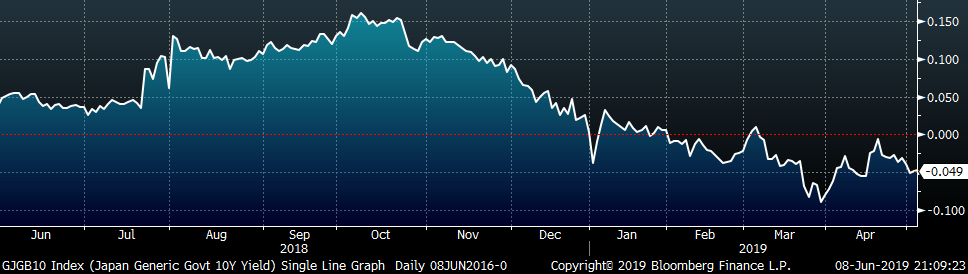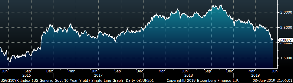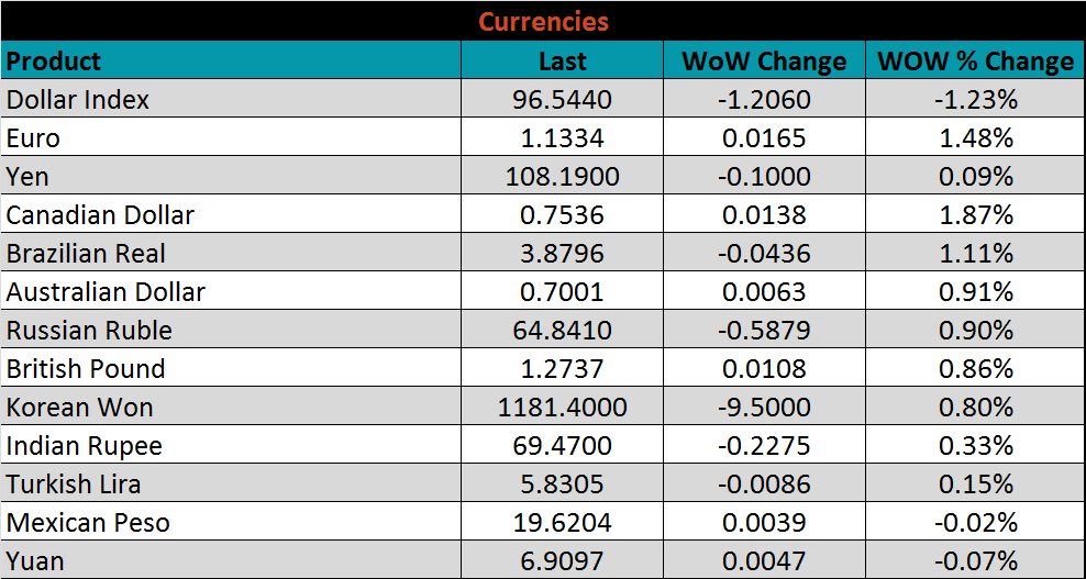 The U.S. 10-year treasury yield was down four basis points, closing the week at 2.08%. The Japanese 10-year yield was down three basis points to -0.12%, and the German 10-year yield was down six more basis points to -0.26%.
