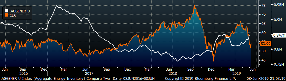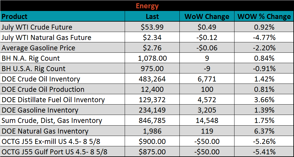 Last week, the July WTI crude oil future gained $0.49 or 0.9% to $53.99/bbl. The aggregate inventory level was up 1.8%, and crude oil production rose to 12.4m bbl/day. The Baker Hughes North American rig count gained nine rigs, while the U.S. lost nine rigs.