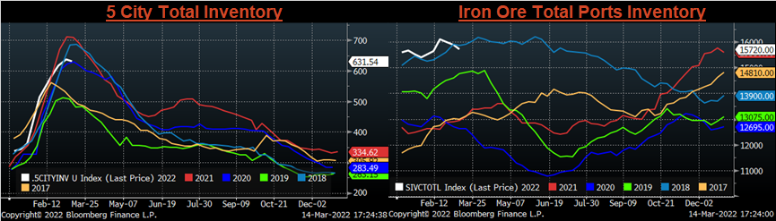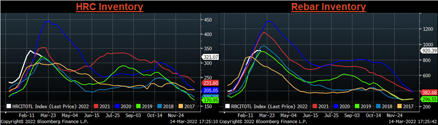 We look at this chart as a reference to show how much negotiating power domestic mills have in the physical market. Intuitively, as the percentage of imports increases, mill negotiating power decreases. Since the peak in November of last year, domestic buyers have pulled back significantly on imports as the domestic price fell. Looking to the next couple of months, we do anticipate a slight uptick in import arrivals from the unexpectedly low level realized in February, as supply chains continue to work themselves out and existing orders make their way through the ports. However, by the middle of 2Q22, arrivals should slow dramatically because of the dynamics we have been highlighting over the last 6-weeks in these reports (i.e., rising global prices and a negative domestic vs. global differentials). This means that when buyers must re-enter the market as inventories decline, the only viable option will be buying domestic, and there is no telling how high domestic prices will be by then.
