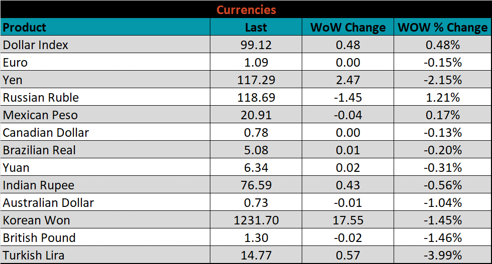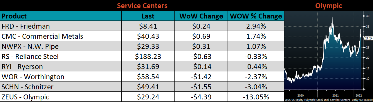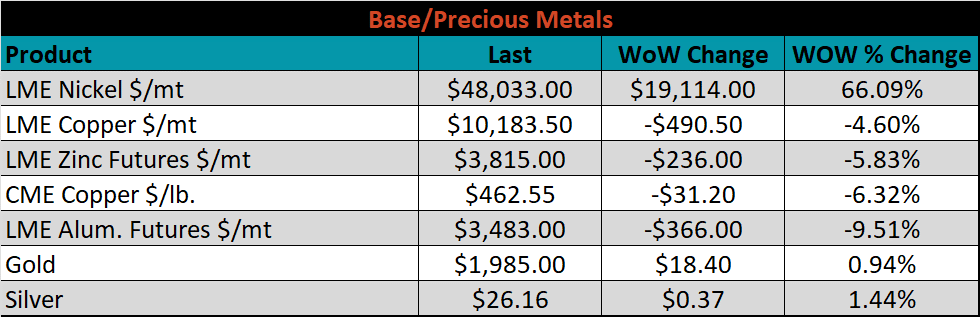 SBB Platt’s HRC, CRC and HDG pricing is below. The Midwest HDG, HRC, and CRC prices were all significantly higher last week, 20.8%, 20%, and 13.3%, respectively. Outside of the U.S., global prices were mostly higher again, led by the South European HRC, up, 26.3%.