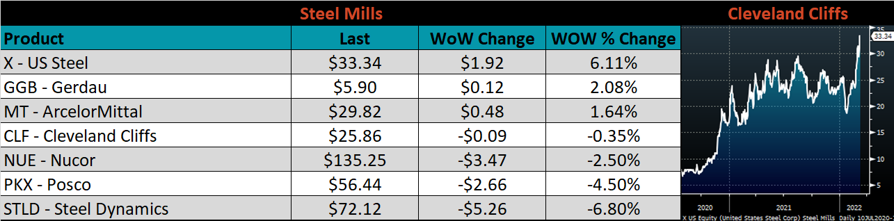 The CME Midwest HRC futures curve is below with last Friday’s settlements in white. The entire curve shifted higher again this week, more so in the later expirations.