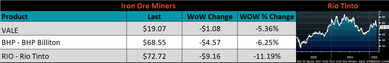 Below is the iron ore future curve with Friday’s settlements in orange, and the prior week’s settlements in green. Last week, the entire curve shifted higher, more significantly in the later expirations.