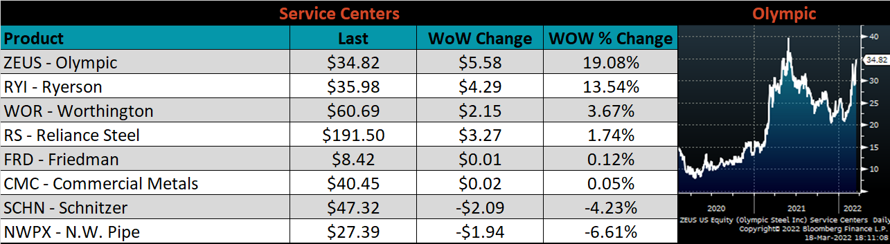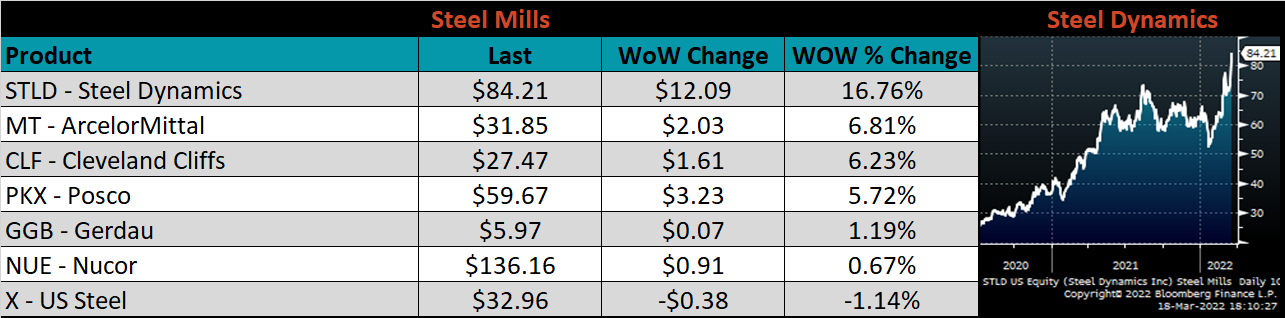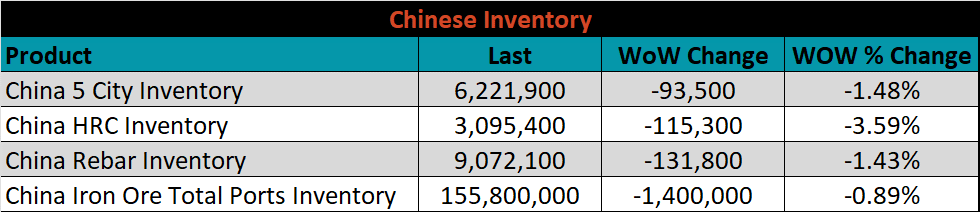 Below is the Midwest HRC price vs. each listed country’s export price using pricing from SBB Platts. We have adjusted each export price to include any tariff or transportation cost to get a comparable delivered price. For the second week in a row, every differential increased except for in the E.U., where their price continues to increase more significantly than U.S. prices.
