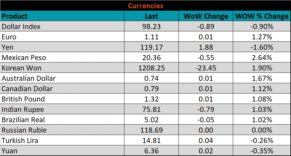 SBB Platt’s HRC, CRC and HDG pricing is below. The Midwest HRC price was up another 8.3%, while CRC & HDG were unchanged. Outside of the U.S., global prices were mostly higher again, led this time by the North European HRC, up, 11.5%.