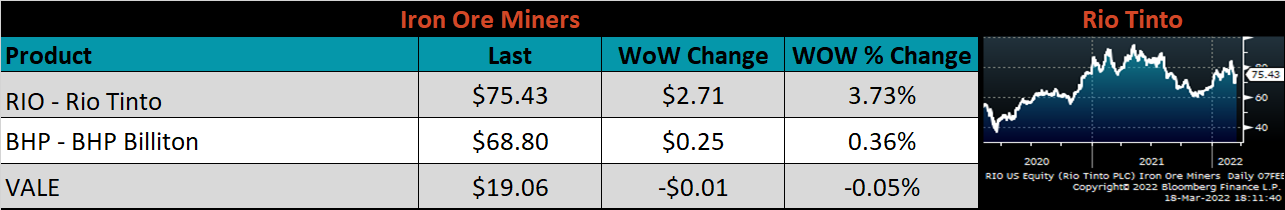 Raw material prices were mostly higher again this week, led by Brazilian pig iron, up another 18.8%, while April iron ore futures which lost 3.7%.