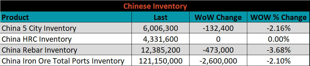 SBB Platt’s HRC, CRC and HDG pricing is below. The Midwest HRC, HDG and CRC prices were down 2.8%, 1.7% and 0.1%, respectively. The Chinese Export HRC and CRC prices were down 6.3% and 4%, respectively.