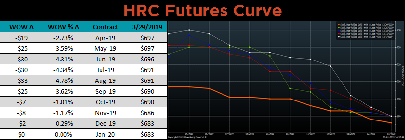 The HRC future curve looks attractive at the current levels for buyers. There are still risk to this outlook, the most pertinent being the removal of tariffs. Specifically, tariff resolution with Mexico and Canada, as both countries have stated Section 232 tariff removal is needed to approve the USMCA trade deal, would weigh on prices.