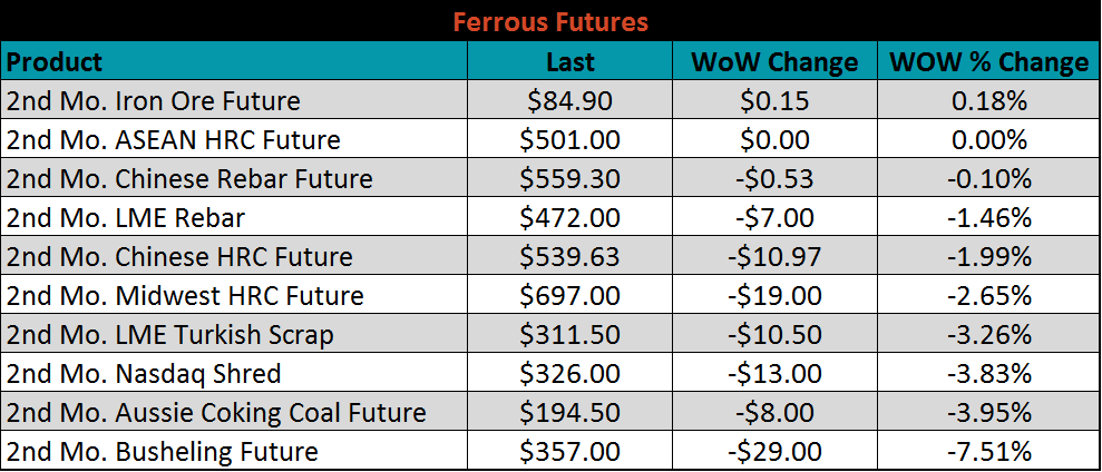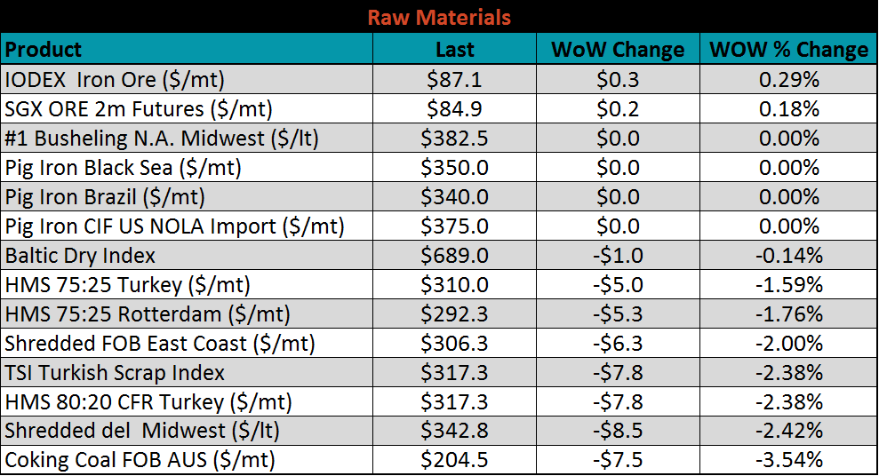 Scrap prices were mostly lower. Australian coking coal was down 3.5%.