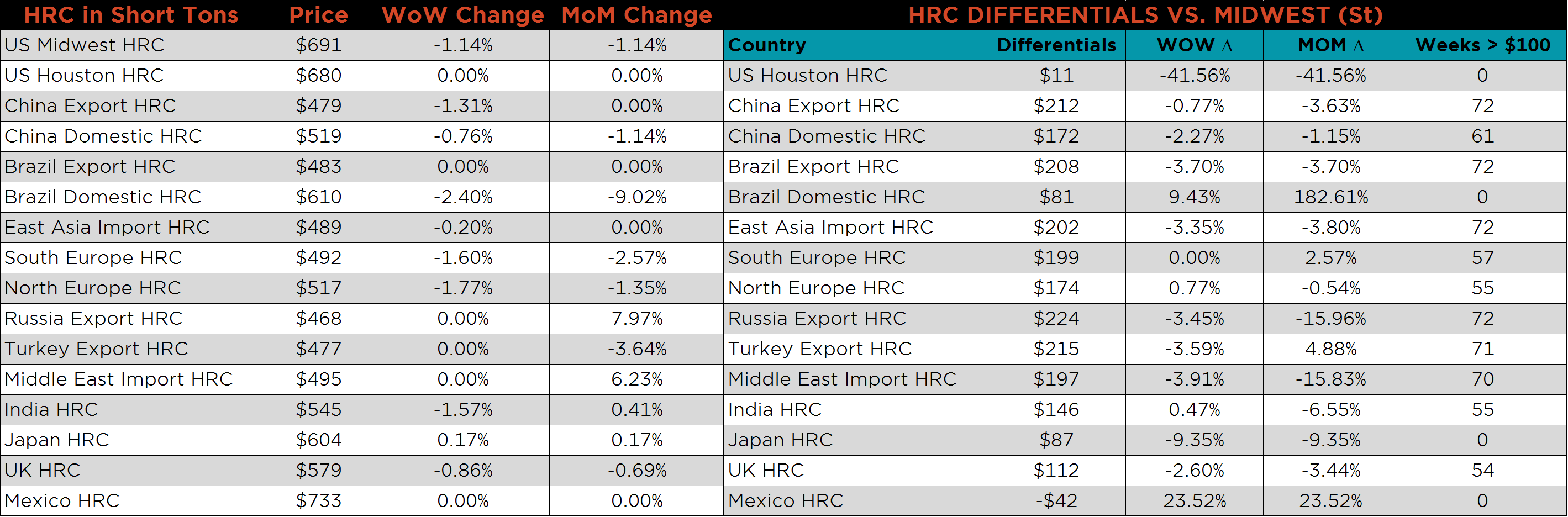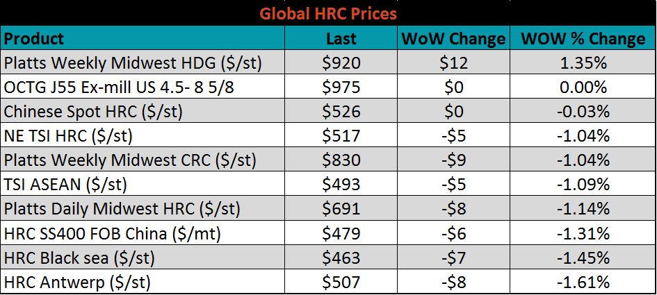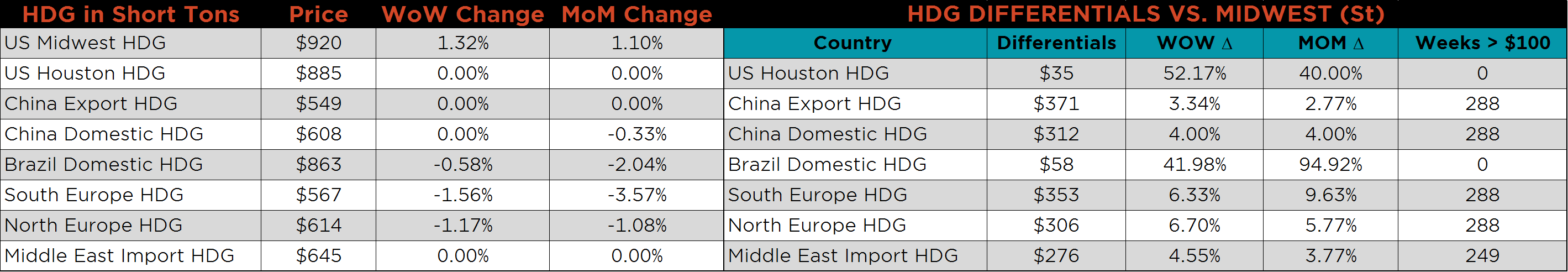 SBB Platt’s HRC, CRC and HDG WoW pricing is below. Midwest HDG gained, while HRC and CRC fell. Brazilian Domestic HRC fell 2.4% while Southern and Northern European CRC fell 2.2% and 2.1%, respectively.