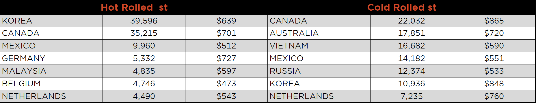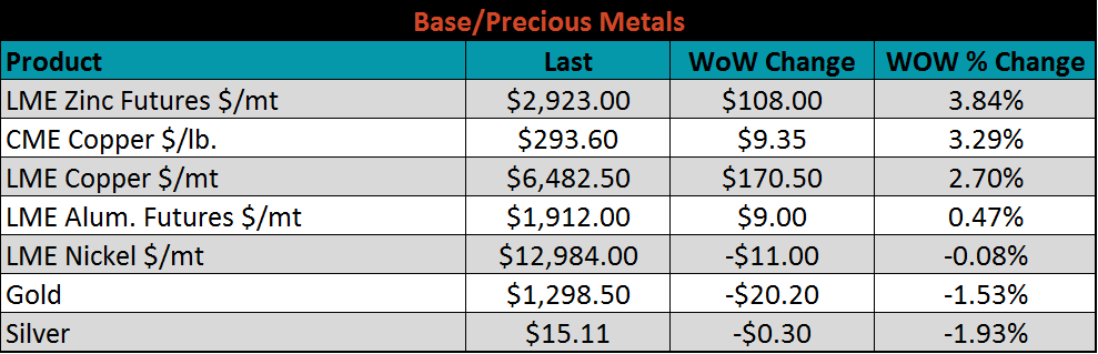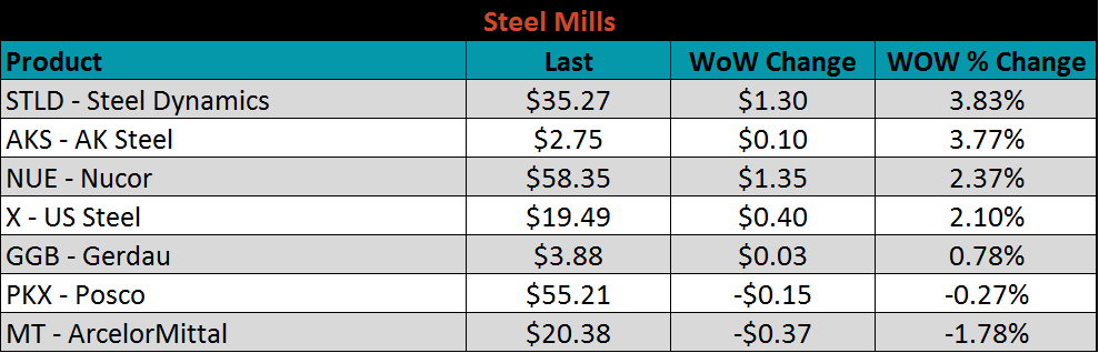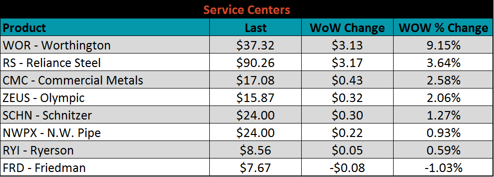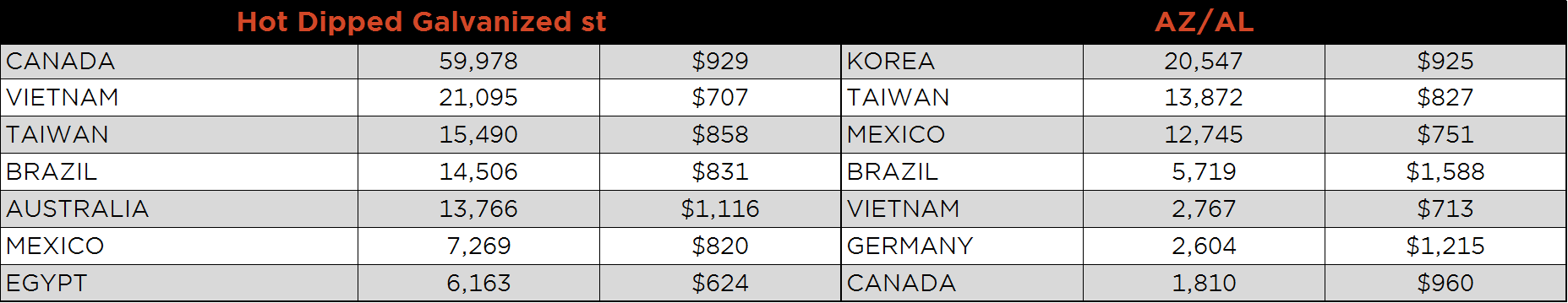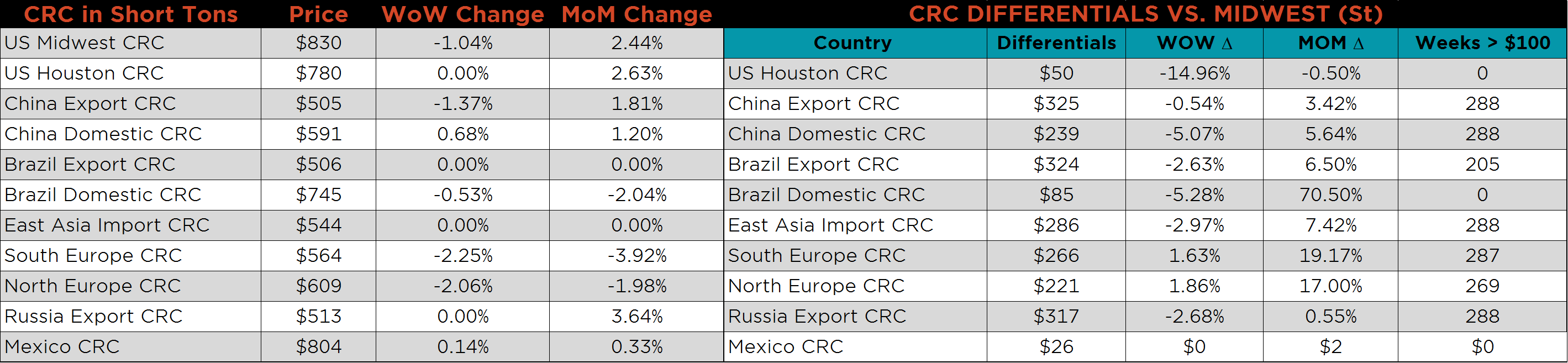 SBB Platt’s HRC, CRC and HDG WoW pricing is below. Midwest HDG gained, while HRC and CRC fell. Brazilian Domestic HRC fell 2.4% while Southern and Northern European CRC fell 2.2% and 2.1%, respectively.