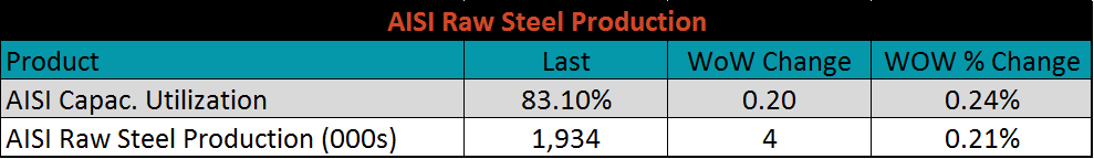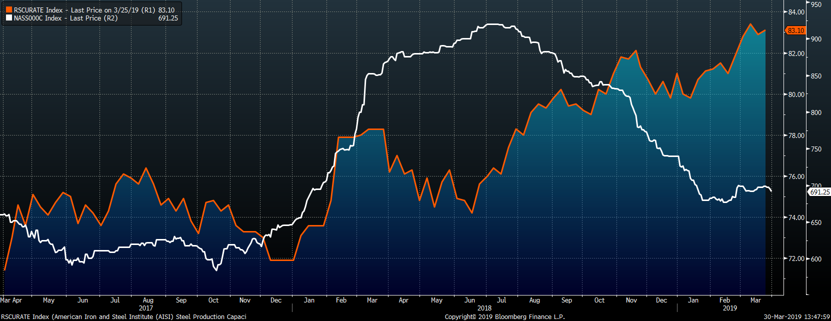 The AISI Capacity Utilization Rate remains elevated at 83.1%. The Trump administration’s goal of 80% Capacity Utilization Rate has held since October 2018, one factor contributing to the price moving lower over that timeframe.