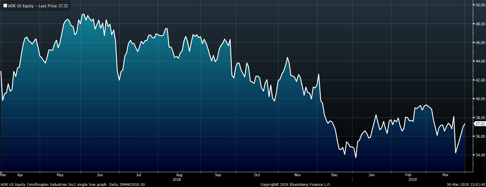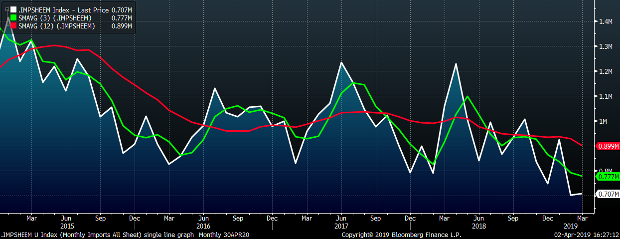 We believe that that the factors weighing on steel prices have largely abated, setting a base for prices to move higher in the second quarter. Inventory levels decreased during the first quarter, and service centers worked through older, high cost material. Lead times have stabilized and even pushed out slightly, removing any incentive to delay material purchases. As the government shutdown ended and economic data became available, it was clear that a recession was not eminent. The Atlanta Fed’s Q1 GDP Forecast moved from near 0% to its current reading of 2.07%. This is an annualized, year over year growth reading, meaning the U.S. economy is continuing to grow from the elevated levels of 2018. Additionally, after raising rates at the December FOMC meeting, the Federal Reserve signaled that they would not be tightening monetary policy in the near future. This supports asset prices and facilitates liquidity in the economy. Importing material will remain unattractive, as the world price continues to move higher, and imports should remain at these low levels.