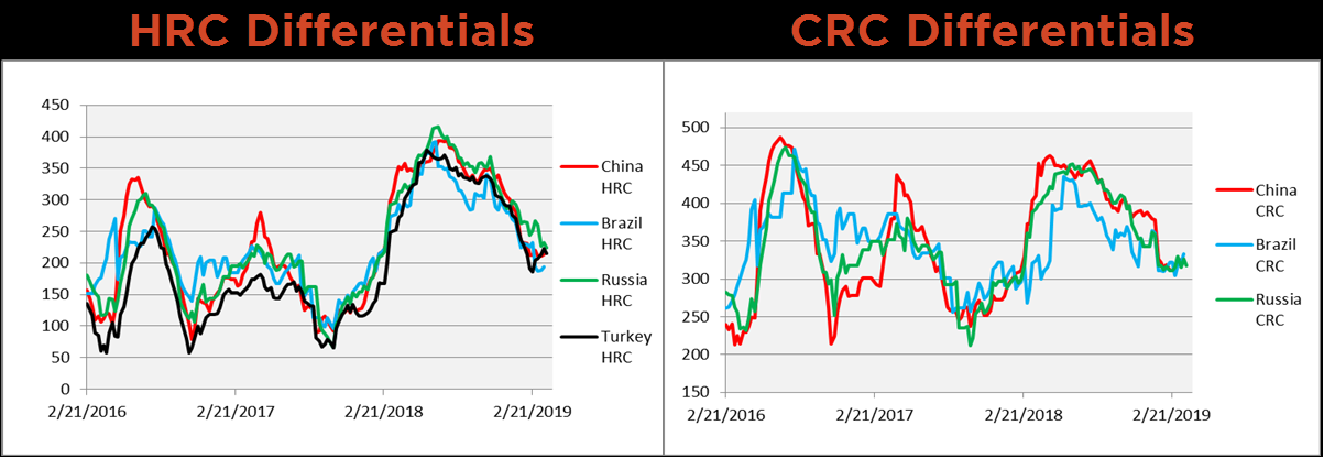 Below are HRC and CRC Midwest vs. each country’s export price differentials using pricing from SBB Platts. Each of the Turkish, Chinese, and Russian HRC differentials decreased last week, while Brazilian increased. All three CRC differentials appear to be range bound.