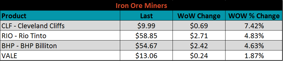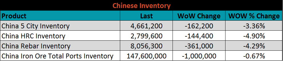 Below are inventory levels for Chinese finished steel products and iron ore. Inventories were lower across the board. HRC and Rebar were each down 4.9% and 4.3%, respectively. The Five City Inventory is down 3.4%, and remains lower compared to levels seen at this point in previous years (red line in the charts below). As economic activity and demand continue to recover, this will be supportive for metals prices in China and the global price. Iron Ore port inventories remain elevated vs prior years. However, this is due to the expected supply disruptions from Vale and Rio and won’t necessarily prevent prices from remaining elevated.