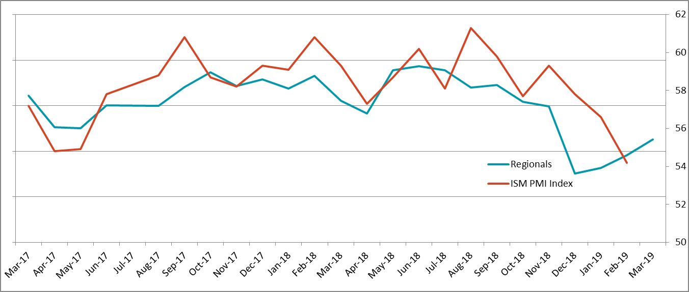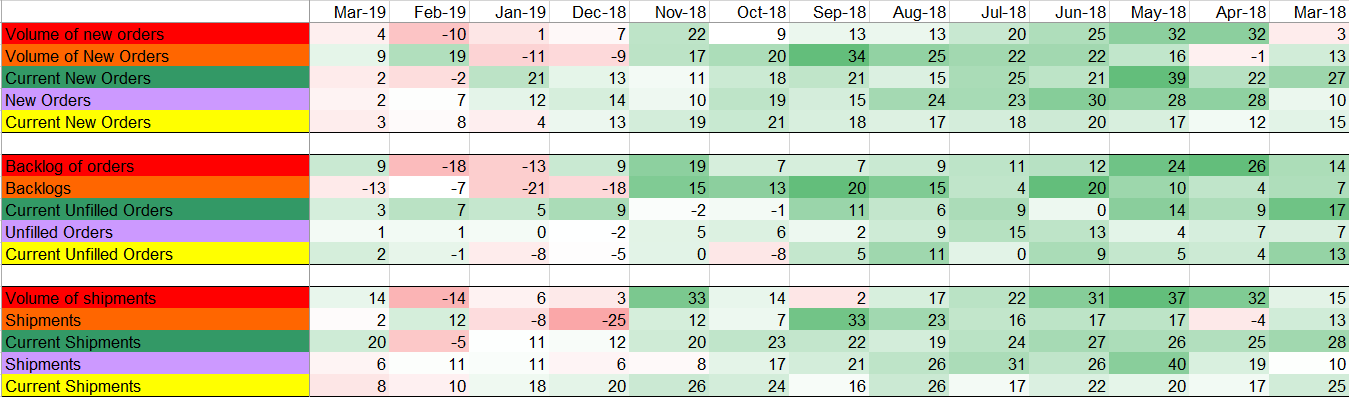 On the economic data front last week, the remaining regional manufacturing surveys were released ahead of the ISM PMI. The chart of the regional surveys vs the ISM PMI below shows the expected stabilization of manufacturing activity in March. With readings above 50, the manufacturing sector continues to expand. The heat map of regional report’s demand related indexes (New Orders, Backlog, and Shipments) shows the strength of 2018. While the indexes have moved away from these high levels, they have recovered from the low levels of December through February.