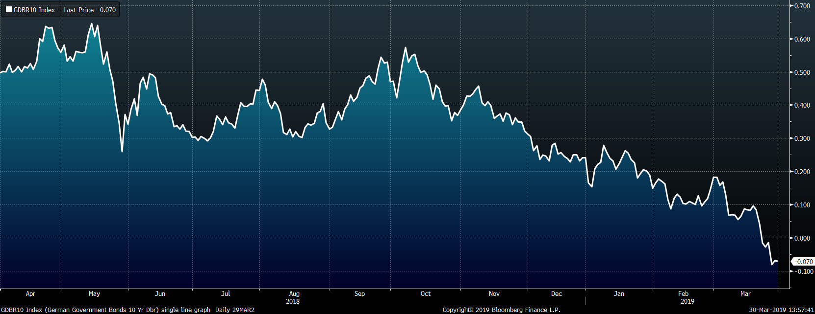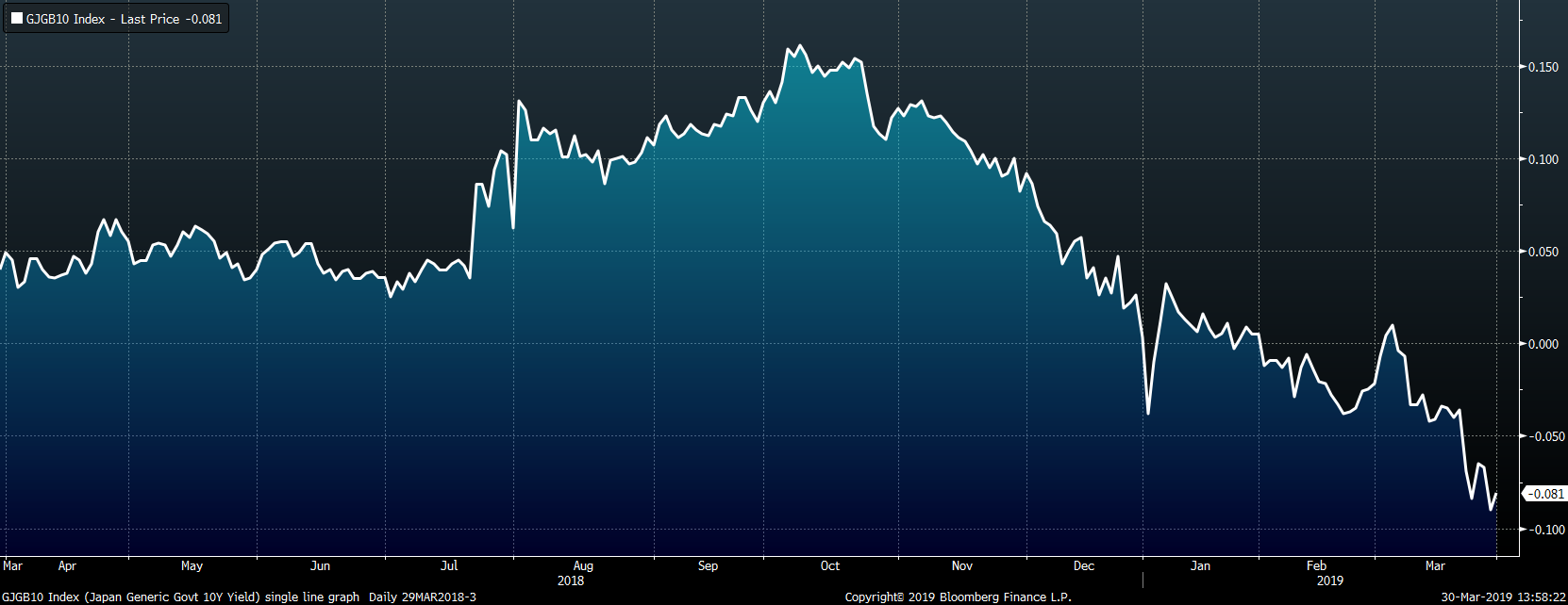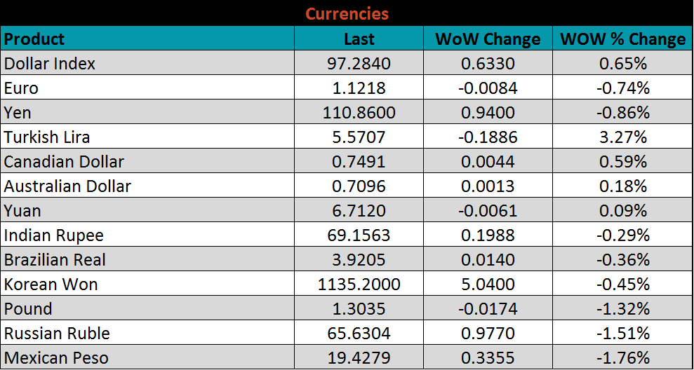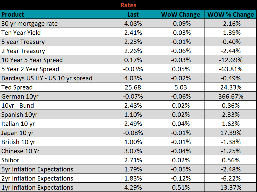 The U.S. 10-year treasury yield was down three basis points closing the week at 2.41%. The German 10-year yield fell another six basis points to -0.07% while the Japanese 10-year yield was down one basis points to -0.08%.