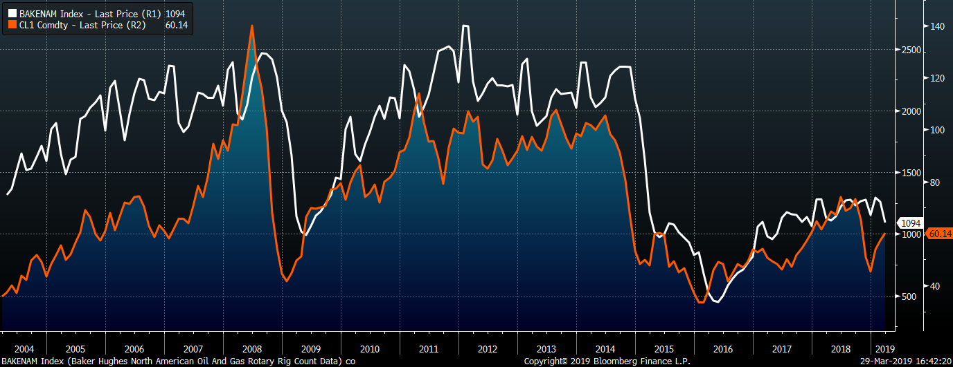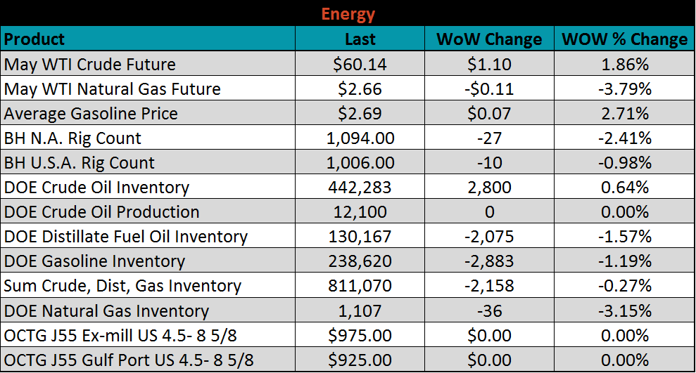 Last week, the May WTI crude oil future gained $1.10 or 1.9% to $60.14/bbl. The aggregate inventory level was slightly down 0.3%. Crude oil production remains at 12.1m bbl/day. The U.S. rig count lost ten rigs while the North American rig count lost 27 rigs. After prices declined sharply in November, rig counts were expected to decline with a multiple month lag. However, the rebound in prices this year may allow oil companies to keep rigs online because they had forward hedges several months into the future.