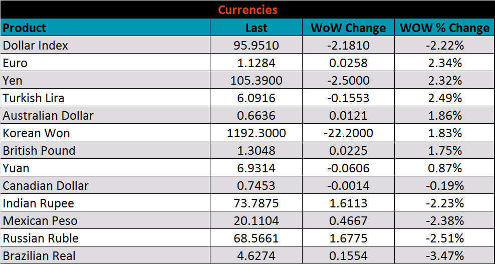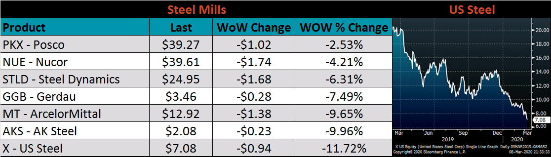 The CME Midwest HRC futures curve is below with last Friday’s settlements in white. The curve was down across all expirations, most significantly in May 2020 to March 2021.