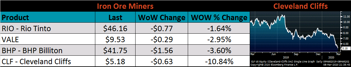 Below are inventory levels for Chinese finished steel products and iron ore. 5 City, HRC and rebar inventory levels continue to increase dramatically, while iron ore port inventory fell further. After the initial decline in Chinese spot and future prices from the coronavirus, record high inventories have not had further effects on pricing.