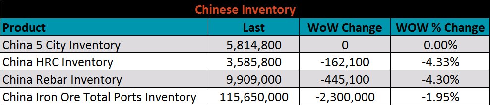 The CME Midwest HRC futures curve is below with last Friday’s settlements in white. The front of the curve shifted higher, while the back was relatively flat.