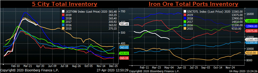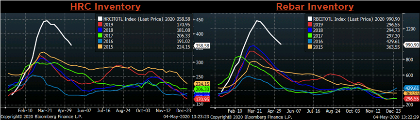 A more significant factor in the domestic supply landscape is the level of production at mills in the US. Currently, mini mills are producing near 70% of their total capacity, while integrated mills are around 30%. However, cuts in production began several weeks ago, limiting the material produced over the last month during the worst of the economic shutdown. Therefore, the collapse in demand did not produce an inventory hangover like the one we saw during the declining demand environment in the first half of 2019. This time, producers got ahead of the curve and created a short squeeze in the market for steel. Additionally, the scrap market continues to see tightness, which explains why mini mills were the first to push for higher spot HRC prices.