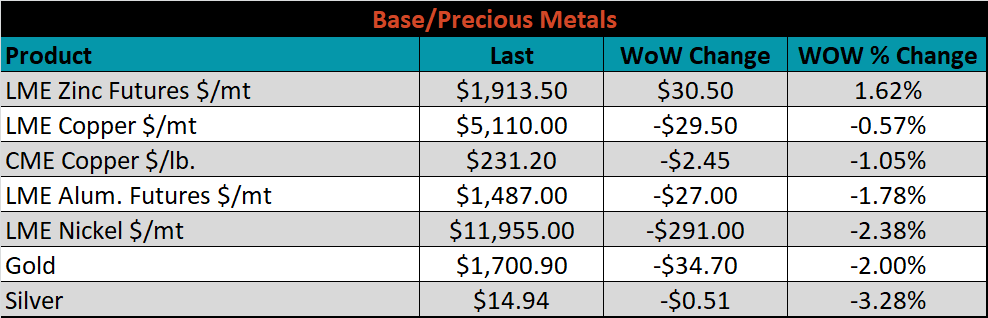 SBB Platt’s HRC, CRC and HDG pricing is below. The Midwest HDG and HRC prices were down 2% and 1.9%, respectively, while the CRC price was unchanged. Globally, the Chinese export HDG and CRC prices were down 2.3% and 1.1%, respectively.