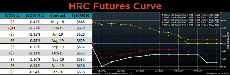 The CME Midwest HRC futures curve is shown below with last Friday’s settlements in white. The entire curve shifted lower, and moved further into contango.