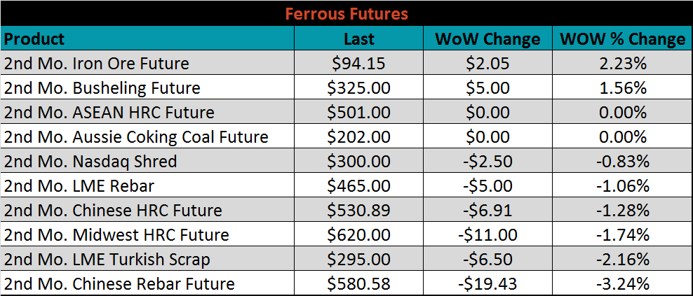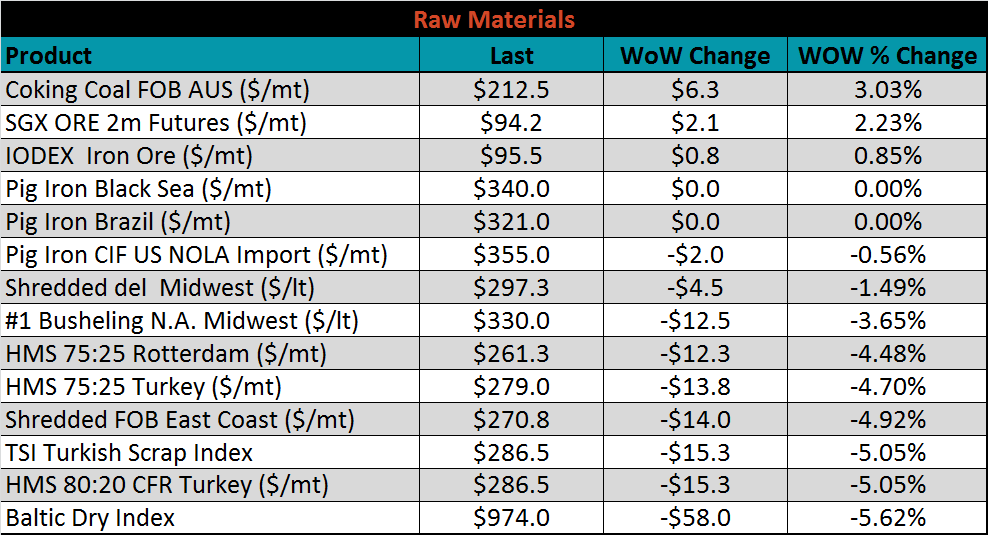 Raw material prices were mixed. Australian coking coal was up 3.3%, while Turkish scrap was down 5.1%.