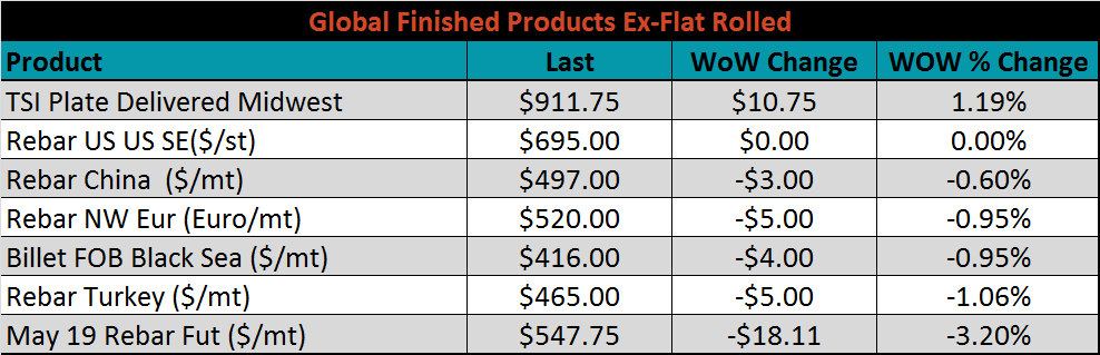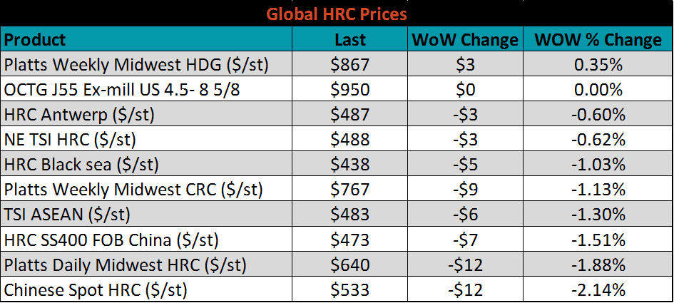 The global flat rolled indexes were mostly lower. Platts Midwest HDG was up slightly 0.4%, while Chinese spot fell 2.1%.