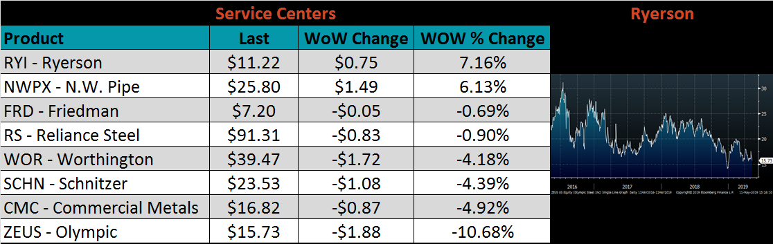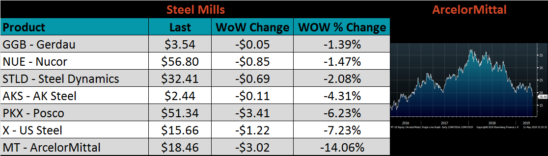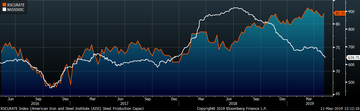 The AISI Capacity Utilization Rate was up 0.9 points to 82.3%. The Trump administration’s goal of 80% Capacity Utilization Rate has held since October 2018, but could be in jeopardy from reduced production at lower prices.