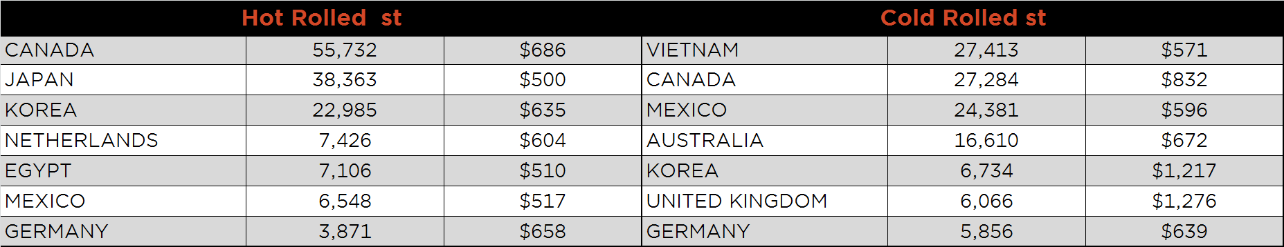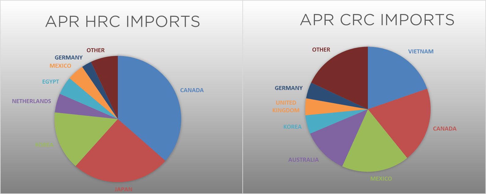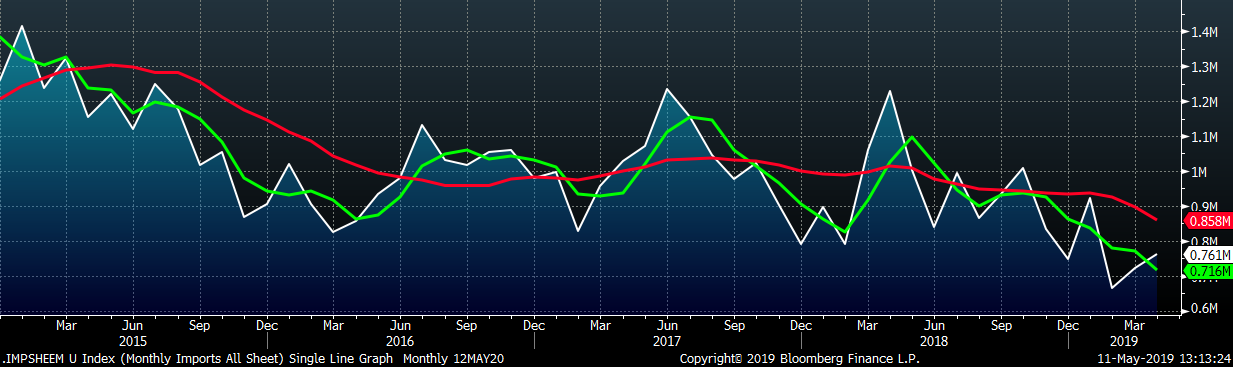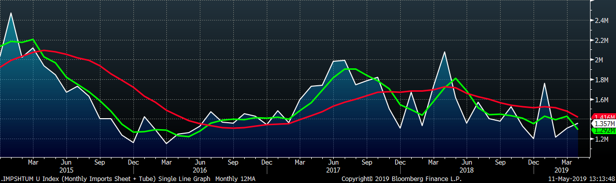 April flat rolled import license data is forecasting an increase to 761k, up 39k MoM.