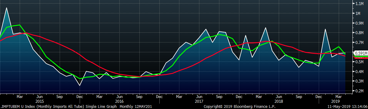 April tube import license data is forecasting a MoM increase of 8k to 591k tons.