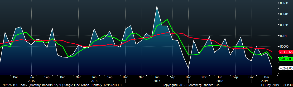 AZ/AL import licenses forecast a decrease of 27k MoM to 40k in April, the lowest monthly level since December 2017.