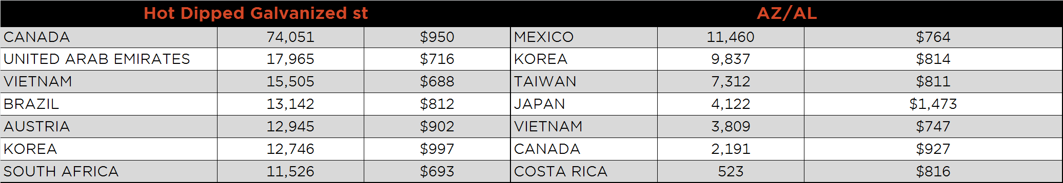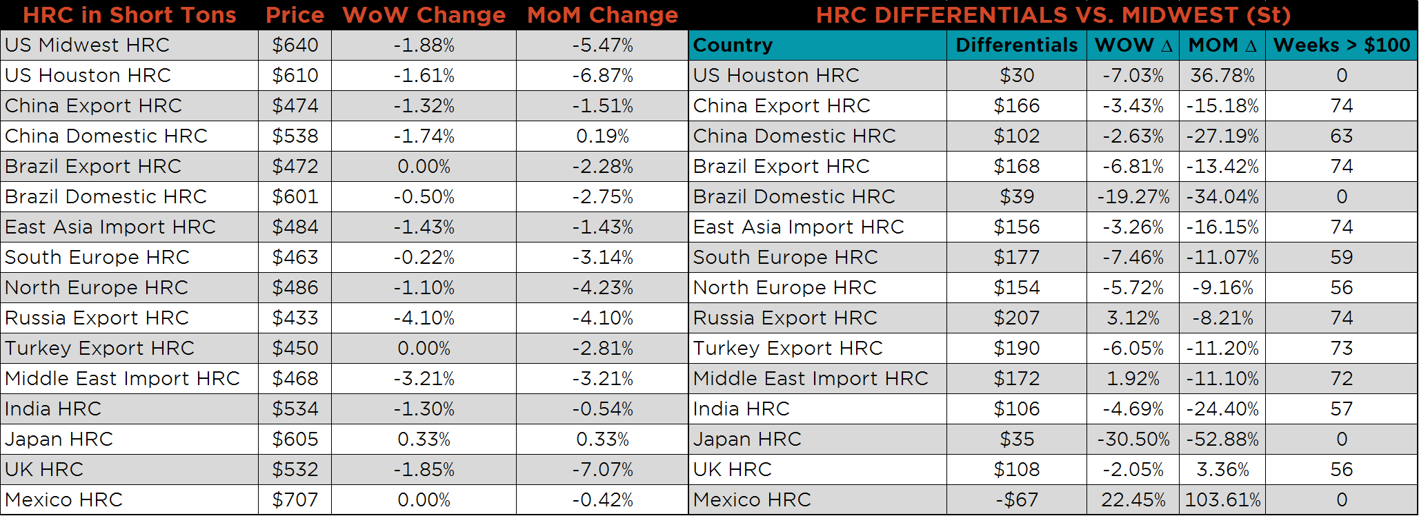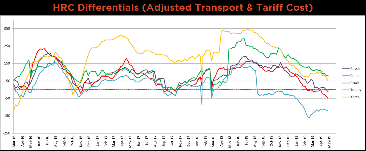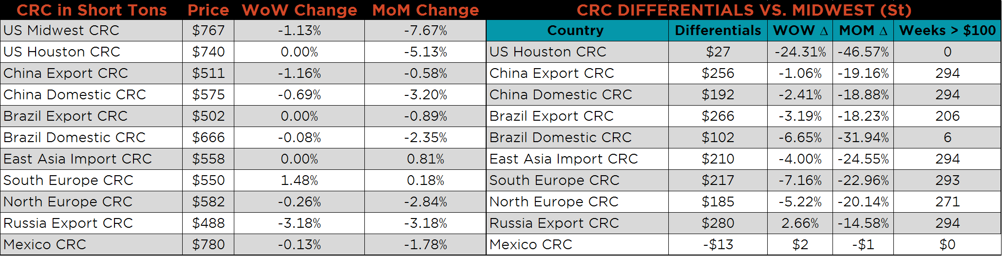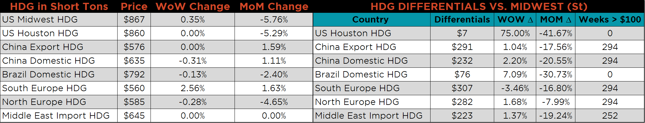 Below is HRC Midwest vs. each listed country’s export price differential using pricing from SBB Platts. We have adjusted each export price to include any tariff or transportation cost to get a comparable delivered price. All of the differentials continued to move lower, and they are approaching a zero differential level that has historically been the bottom for both differentials and domestic prices.