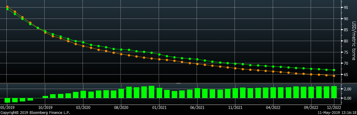 Below is the Iron Ore future curve with Friday’s settlments in orange, and one week prior’s settlements in green.