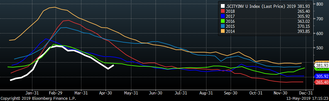 Below are inventory levels for Chinese finished steel products and iron ore. Elevated spot iron ore prices have led to the recent trend in lower total ports inventory, as steel producers look to diminish existing inventory before paying the higher prices. The 5 City inventory rose 7.4% last week, but remains at the lowest level over the past 5 years.