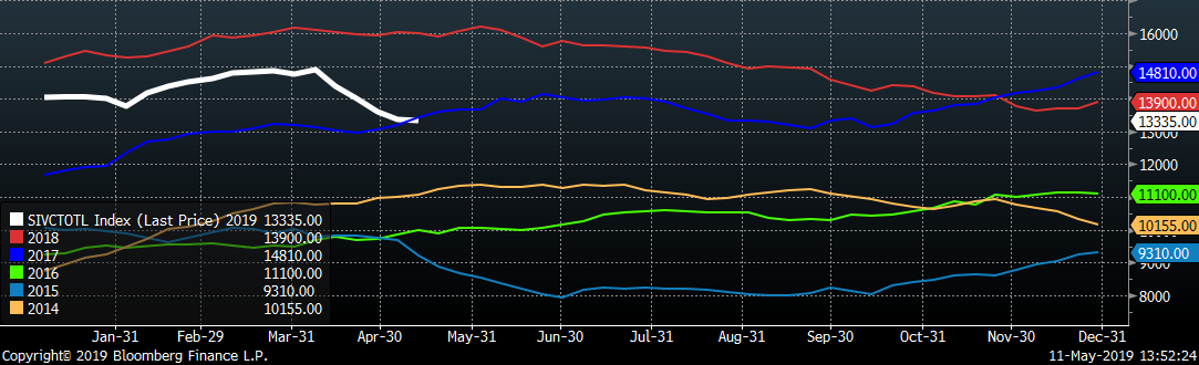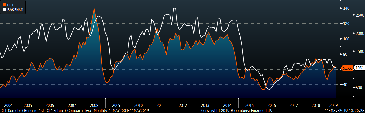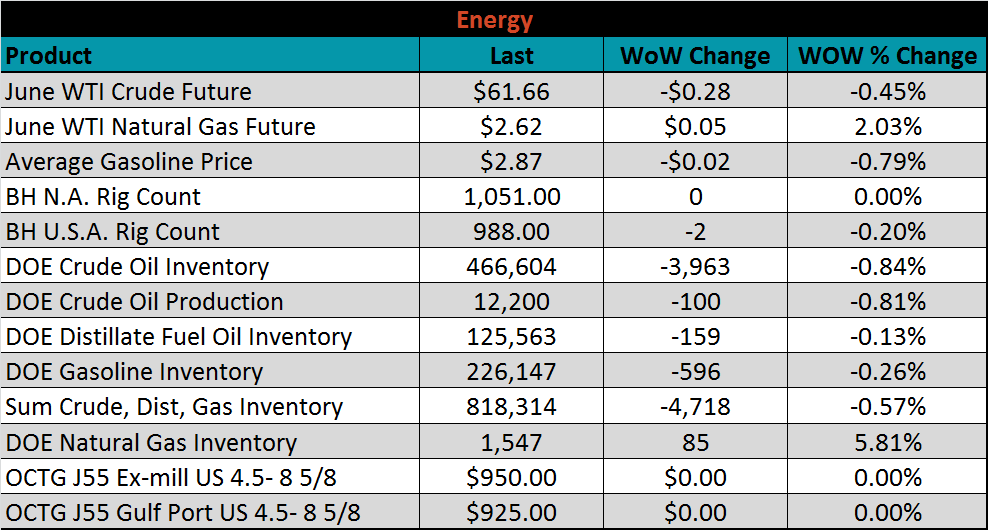 Last week, the June WTI crude oil future lost $0.28 or 0.45% to $61.66/bbl. The aggregate inventory level was down 0.6%, and crude oil production fell back down to 12.2m bbl/day. The U.S. rig count lost two rigs, while the North American rig count was unchanged.