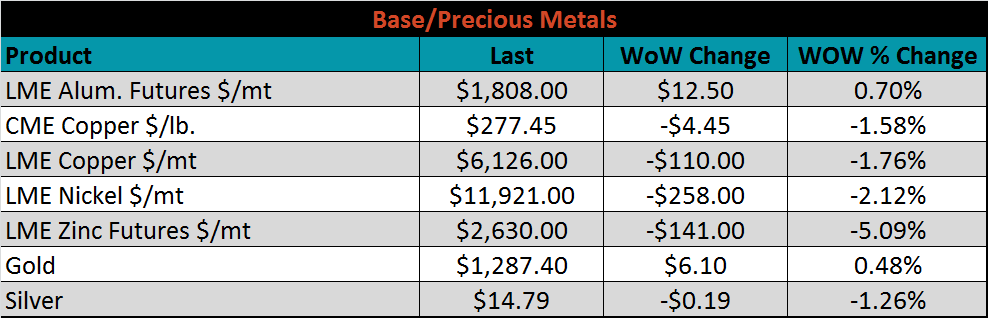 SBB Platt’s HRC, CRC and HDG pricing is below. Midwest HRC and CRC prices were lower on the week, 1.9% and 1.3%, respectively, while the HDG price was slightly higher. The Russian CRC and HRC were both down 4.1% and 3.2%, respectively while Middle East HRC Import price was down 3.2%.